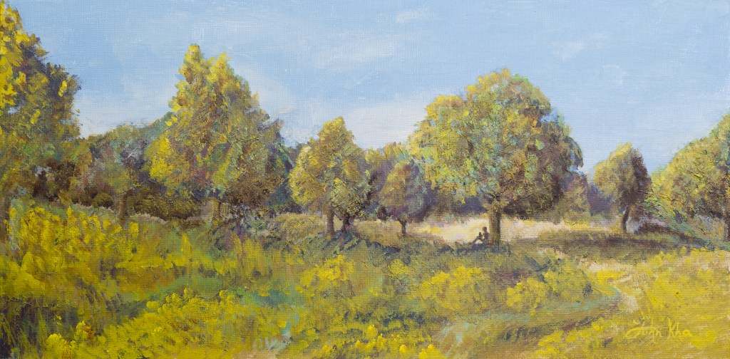 “A few weeks ago while on a scooter ride, we noticed someone resting peacefully against a tree in the distance. Their silhouette was blended into the colours of Autumn while they appeared to be completely present, enjoying the sun and the company of trees. I finished this acrylic painting last night and titled it ‘New Beginnings’, inspired by this memory and our experiences during this pandemic” (20 May 2020)